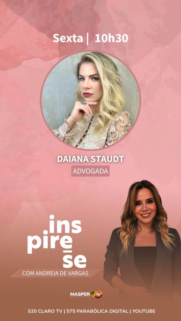A Dra. Daiana Staudt, advogada, participa nesta sexta-feira, dia 23 de janeiro, do programa de TV Inspire-se, transmitido pela emissora Masper TV. Sob o comando da apresentadora Andreia de Vargas, o programa é conhecido por trazer histórias e trajetórias que motivam o público.